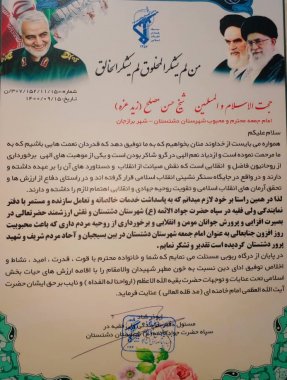 *لذا در همین راستا بر خود لازم می دانم که به پاسداشت خدمات خالصانه و تعامل سازنده و مستمر با دفتر نمایندگی ولی فقیه در سپاه حضرت جواد الائمه (ع) شهرستان دشتستان و نقش ارزشمند حضرتعالی در بصیرت افزایی و پرورش جوانان مومن و انقلابی و برخورداری از روحیه مردم داری که باعث محبوبیت روز افزون جنابعالی به عنوان امام جمعه شهرستان دشتستان در بین بسیجیان و آحاد مردم شریف و شهید پرور دشتستان گردیده است تقدیر و تشکر نمایم.*