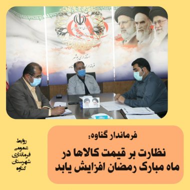 ◽فرماندار گناوه افزود: دستگاههای متولی نیز با توجه به ایام ماه مبارک رمضان نظارتها و بازرسی را به طور کامل و دقیق و با جدیت بیشتر انجام دهند و با قیمتهای نامتعارف کالاهای اساسی برخورد قانونی شود.