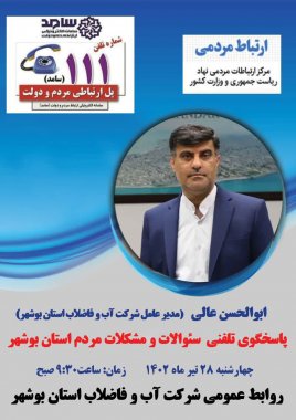 هم استانیهای عزیز میتوانند در روز چهارشنبه ساعت ۹:۳۰ دقیقه صبح از طریق تماس تلفنی با شماره ۱۱۱، با مدیرعامل شرکت آب و فاضلاب استان بوشهر به طور مستقیم گفتگو کنند.