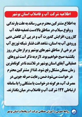 نوای چنوب:به اطلاع مشترکین محترم می رساند به علت بارندگی و وقوع سیلاب در مناطق بالادست تصفیه خانه آب کازرون، افزایش کدورت آب و در پی آن کاهش دبی ورودی آب به استان، شاهد افت فشار شبکه توزیع آب در برخی از مناطق شهرهای بوشهر و برازجان در روز یکشنبه صبح خواهیم بود