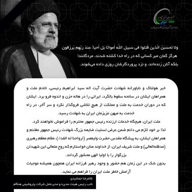 نوای جنوب:دکتر غلامرضا جمشیدی مدیرعامل پتروشیمی هنگام بمناسبت شهادت سید محرومان ،شهید قلبهای محرومان جهان سید ابراهیم رئیسی ریاست جمهور پیام تسلیتی صادر کردند