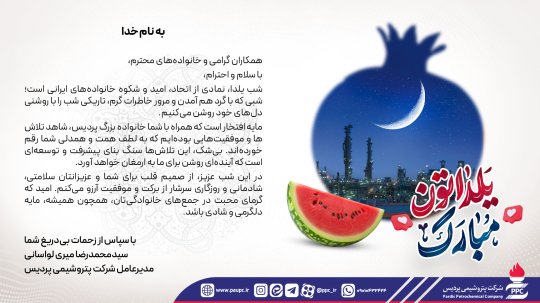 دکتر سید محمدرضا میری لواسانی در پیامی با تبریک فرا رسیدن شب یلدا به خانواده بزرگ پتروشمی پردیس، این سنت را نمادی از اتحاد، امید و شکوه خانواده های ایرانی توصیف کرد. متن پیام مدیرعامل شرکت پتروشیمی پردیس به شرح زیر است: