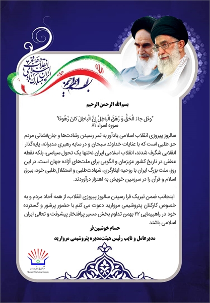 اینجانب ضمن تبریک فرا رسیدن سالروز پیروزی انقلاب اسلامی، از همه آحاد مردم و به خصوص کارکنان پتروشیمی مروارید دعوت می کنم با حضور پرشور و گسترده خود در راهپیمایی ۲۲ بهمن تداوم بخش مسیر پرافتخار پیشرفت و تعالی ایران اسلامی باشند.