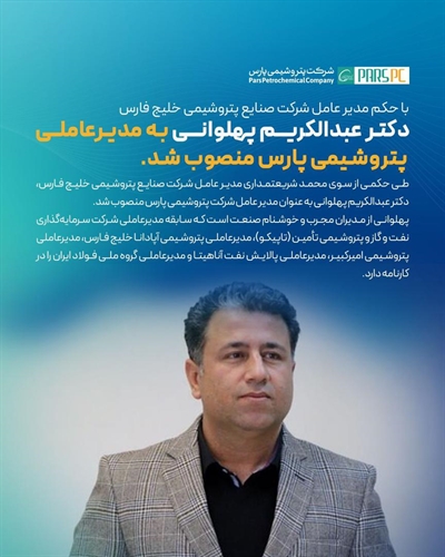 نوای جنوب:با حکم مدیر عامل شرکت صنایع پتروشیمی خلیج فارس، عبدالکریم پهلوانی به مدیرعاملی پتروشیمی پارس منصوب شد.