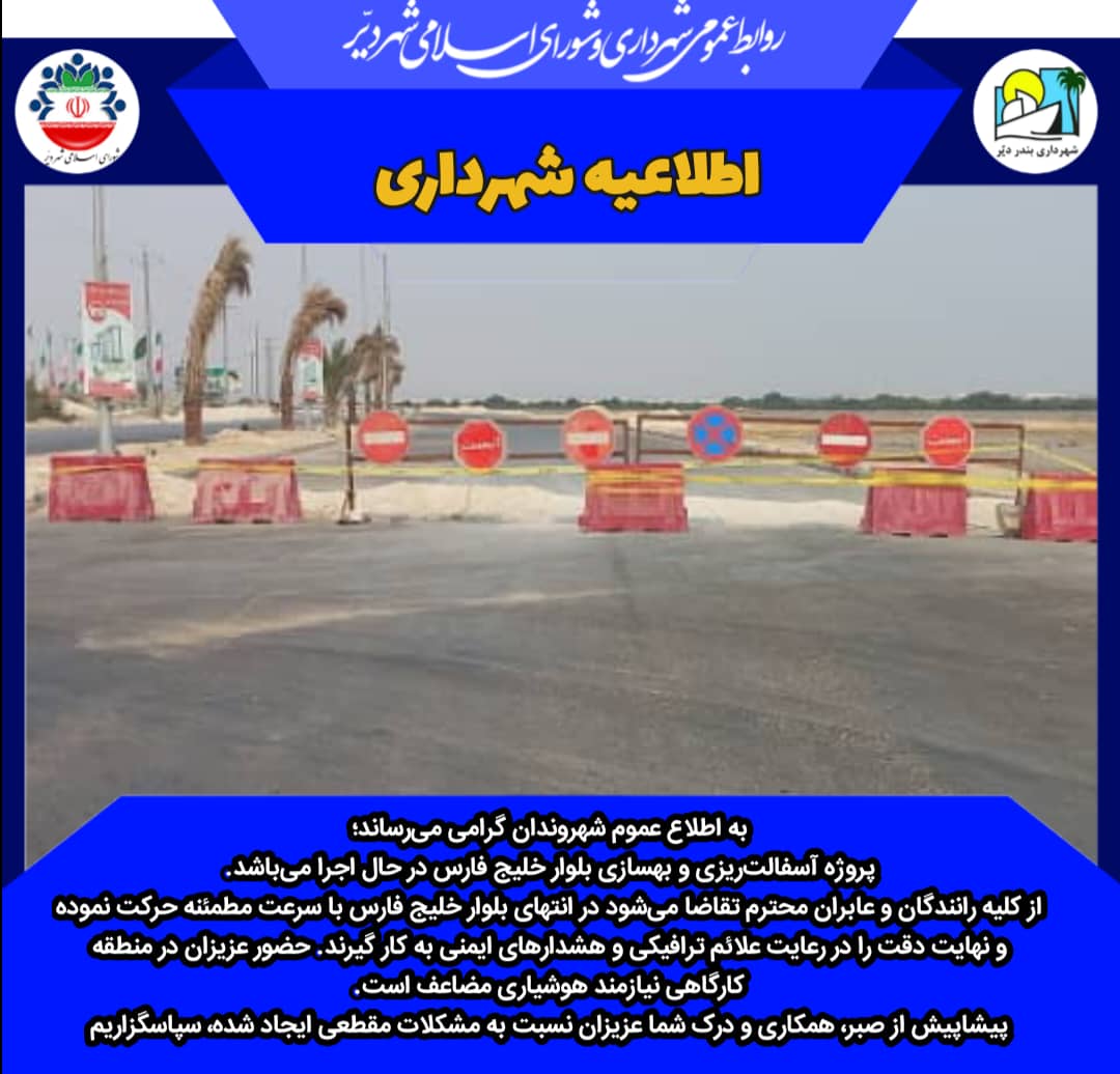 از کلیه رانندگان و عابران محترم تقاضا میشود در انتهای بلوار خلیج فارس با سرعت مطمئنه حرکت نموده و نهایت دقت را در رعایت علائم ترافیکی و هشدارهای ایمنی به کار گیرند. حضور عزیزان در منطقه کارگاهی نیازمند هوشیاری مضاعف است.