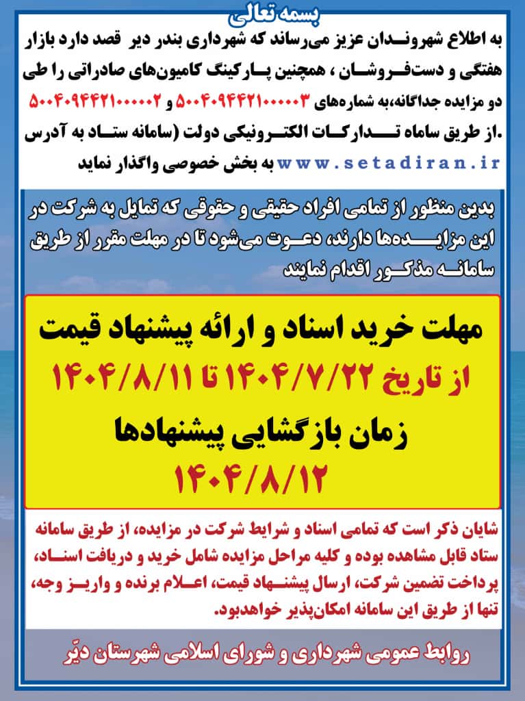 به اطلاع شهروندان عزیز میرساند که شهرداری بندر دیر قصد دارد بازار هفتگی و دستفروشان ، همچنین پارکینگ کامیونهای صادراتی را طی دو مزایده جداگانه،به شمارههای ۵۰۰۴۰۹۴۴۲۱۰۰۰۰۰۳ و۵۰۰۴۰۹۴۴۲۱۰۰۰۰۰۲ از طریق سامانه تدارکات الکترونیکی دولت (سامانه ستاد به آدرس www.setadiran.ir)، به بخش خصوصی واگذار نماید.