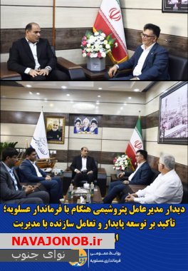 نوای جنوب:در راستای گسترش همکاریهای متقابل، مهندس عبدالمجيد خاکسار مدیر عامل شرکت پتروشیمی هنگام با دکتر پاسلار فرماندار شهرستان عسلویه دیدار و گفتوگو کرد.