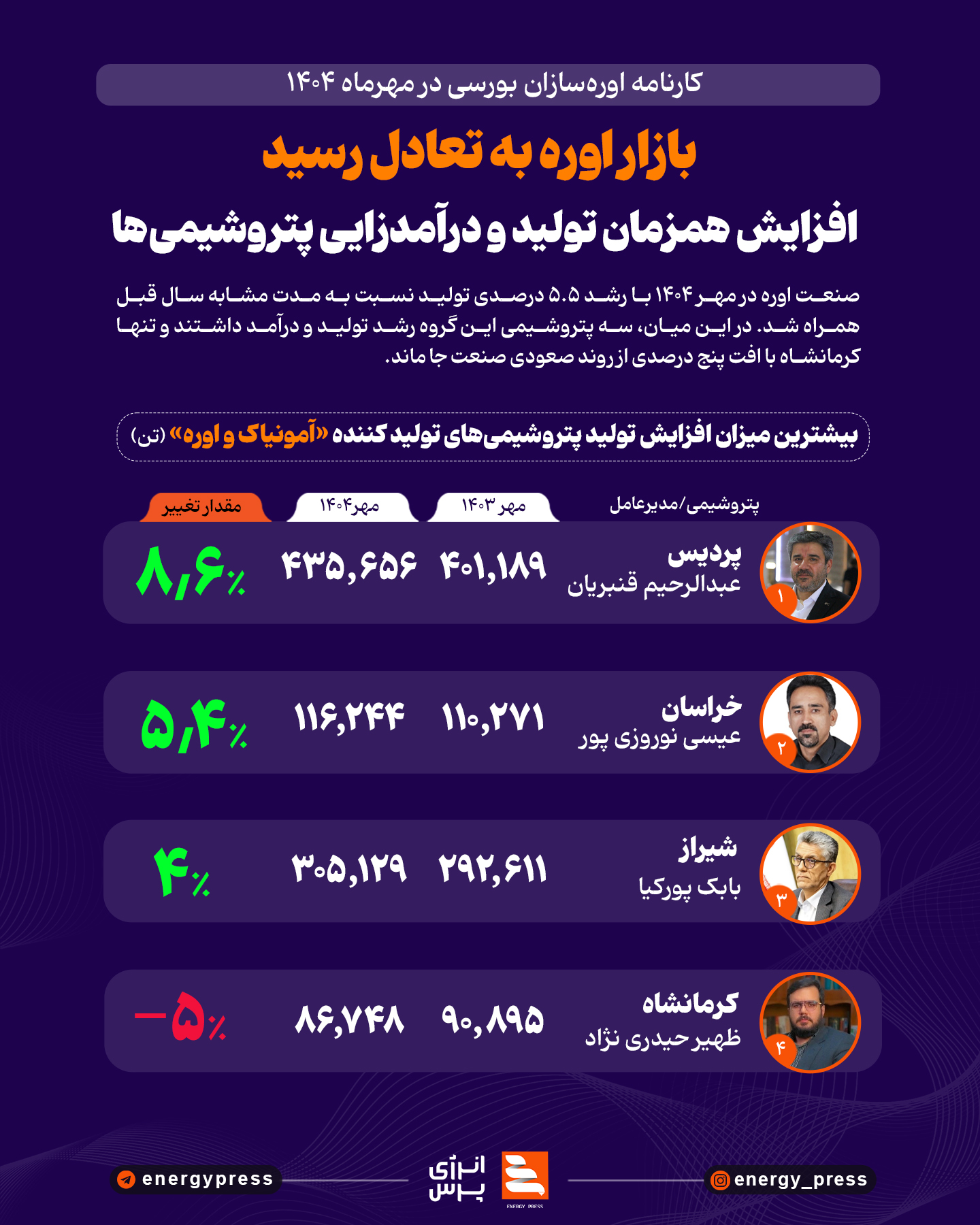در میان آنها، پتروشیمی پردیس با رشد ۸.۶ درصدی تولید، پیشتاز این گروه بود و سهم قابلتوجهی از رشد کل صنعت را به خود اختصاص داد. خراسان و شیراز نیز با رشدهای ملایمتر به ترتیب ۵.۴ و ۴ درصدی در مدار صعود قرار گرفتند، اما کرمانشاه با افت پنج درصدی از موج افزایش تولید جا ماند.