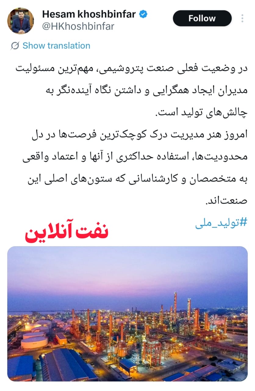 نوای جنوب:مهعندس حسام خوش بین فر مدیرعامل پتروشیمی مروارید و ار کارشناسان نخبه صنعت پتروشیمی در شبکه ایکس مطلبی قابل استناد و جالب منتشر کرد