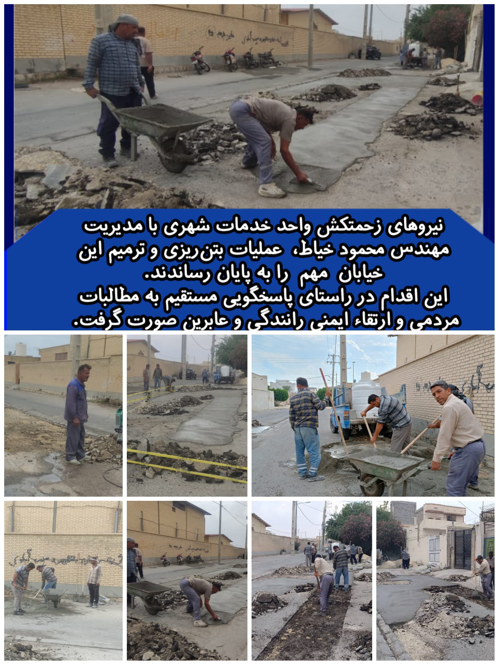 «یکی از مطالبات اصلی و بهحق مردمی شهروندان محترم، وضعیت فرسودگی و ایجاد چالههای متعدد در سطح خیابان ورزش بود که این امر تردد را با مشکل مواجه کرده بود. بنا بر این، در دستور کار واحد خدمات شهری قرار گرفت تا با استفاده از ظرفیتهای موجود و نیروهای زحمتکش این واحد، نسبت به ترمیم اساسی این مسیر اقدام نماییم.