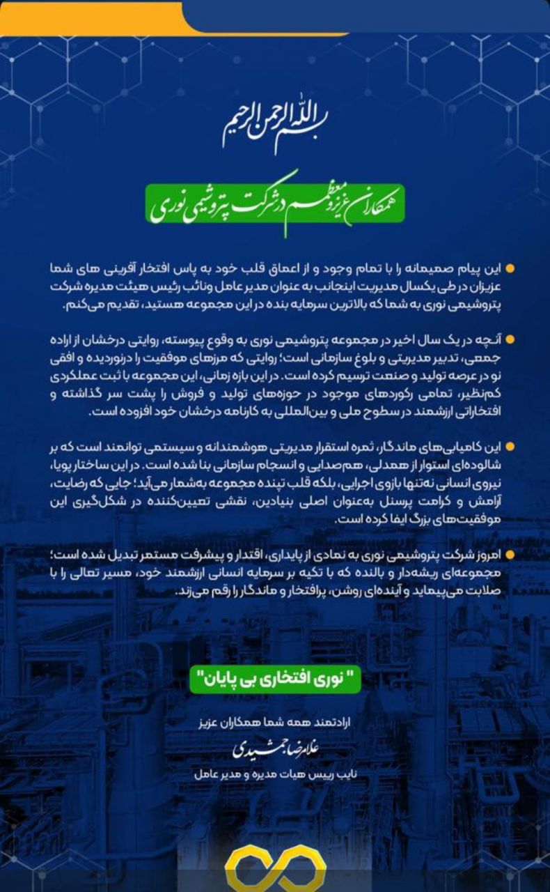 به پاس افتخار افرینی متمادی،تشکر نامه صمیمانه دکتر جمشیدی مدیرعامل از همکاران در پتروشیمی نوری+تصویر