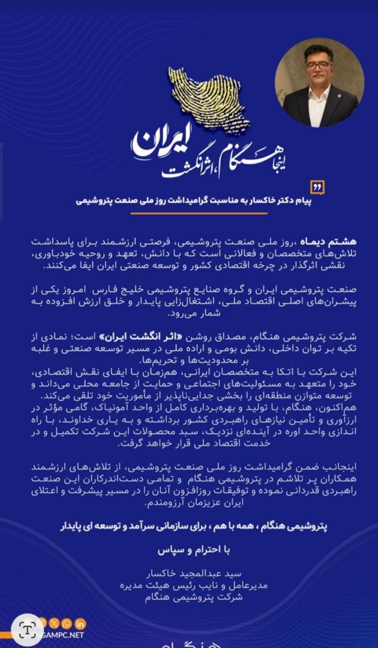 نوای جنوب:دکتر حجت اله خاکسار مدیرعامل پتروشیمی هنگام بمناسبت روز پتروشیمی پیامی صادر کردند