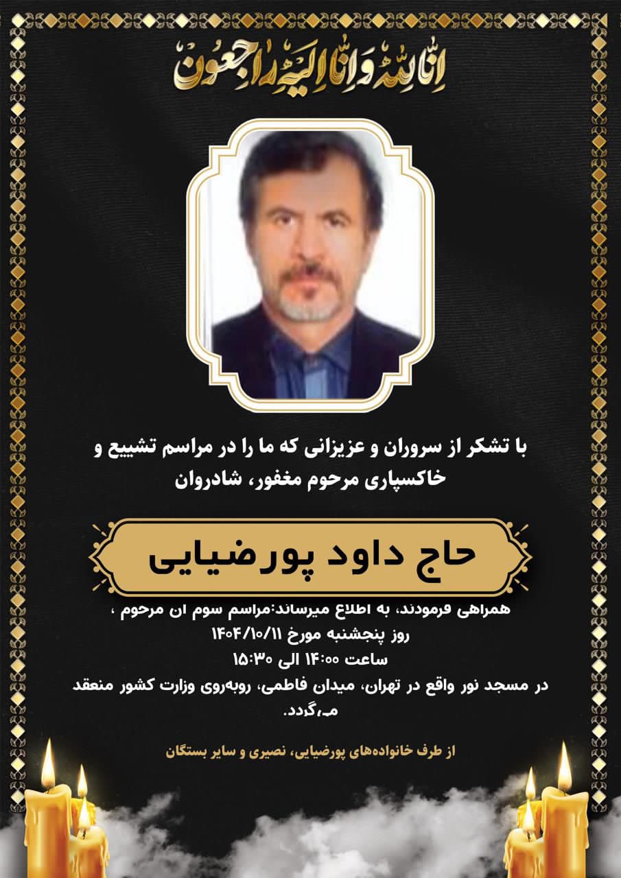 نوای جنوب:در اطلاعیه ای زمان برکزاری مراسم ختم شادروان مهندس حاج داود پورضیایی عموی دکتر کمیل پورضیایی مدیرعامل پتروشیمی خارگ اعلام گردید