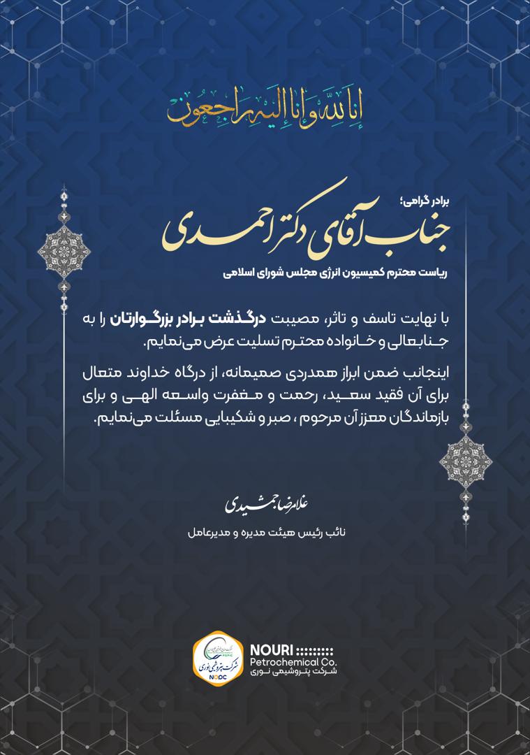 نوای جنوب:دکتر غلامرضا جمشیدی مدیرعامل پتروشیمی نوری در پی درگذشت برادر گرانقدر دکتر موسی احمدی نماینده جنوب استان بوشهر و رئیس کمیسیون انرژی مجلس پیام تیلیتی صادر نمودند