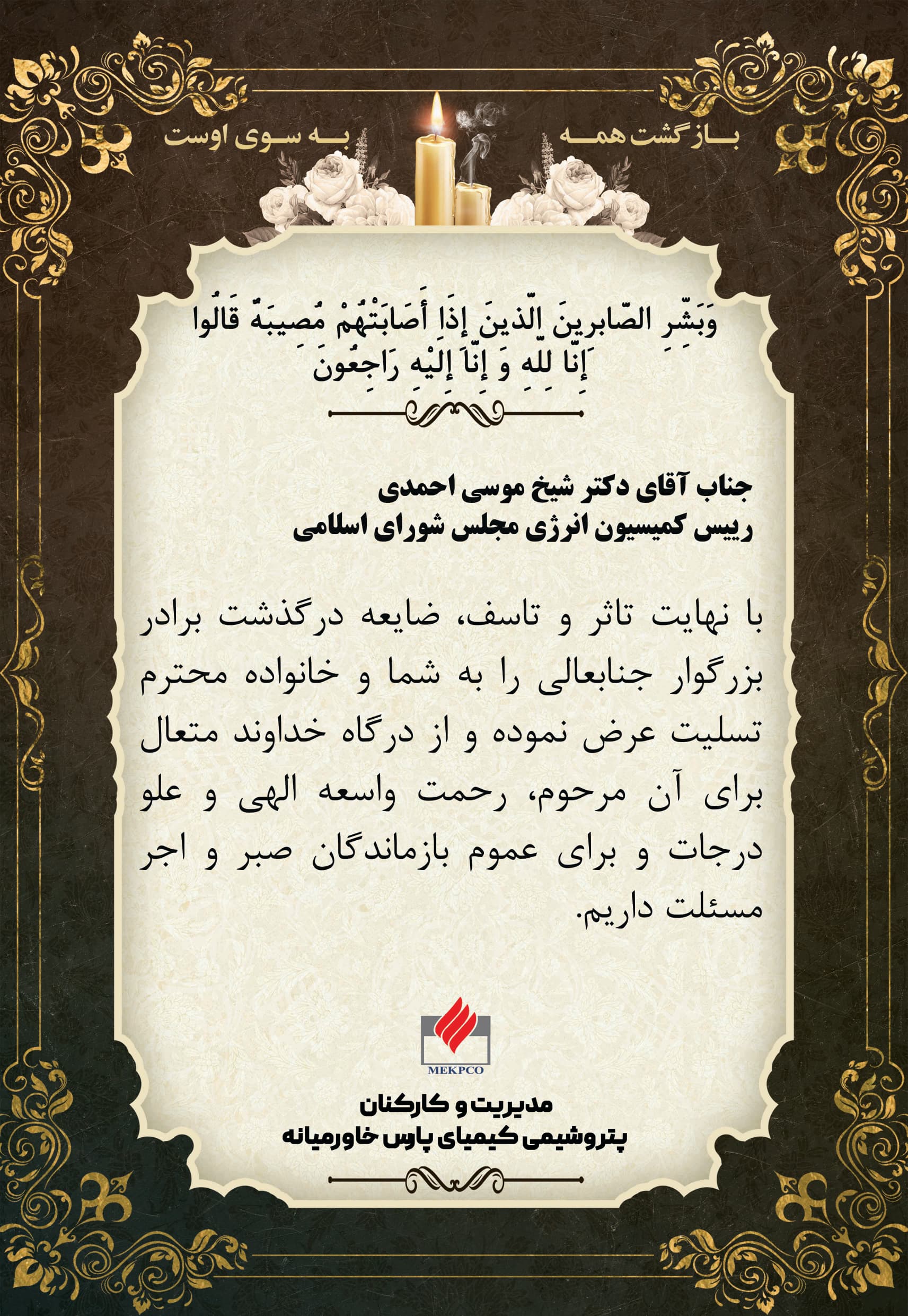 نوای جنوب:درپی درگذشت برادر بزرگوار و معزز دکتر موسی احمدی رئیس کمیسیون انرزی مجلی دکتر حبیب اله دیباجی مدیرعامل پتروشیمی پارس کیمیای خاورمیانه پیام تسلیتی صادر کردند